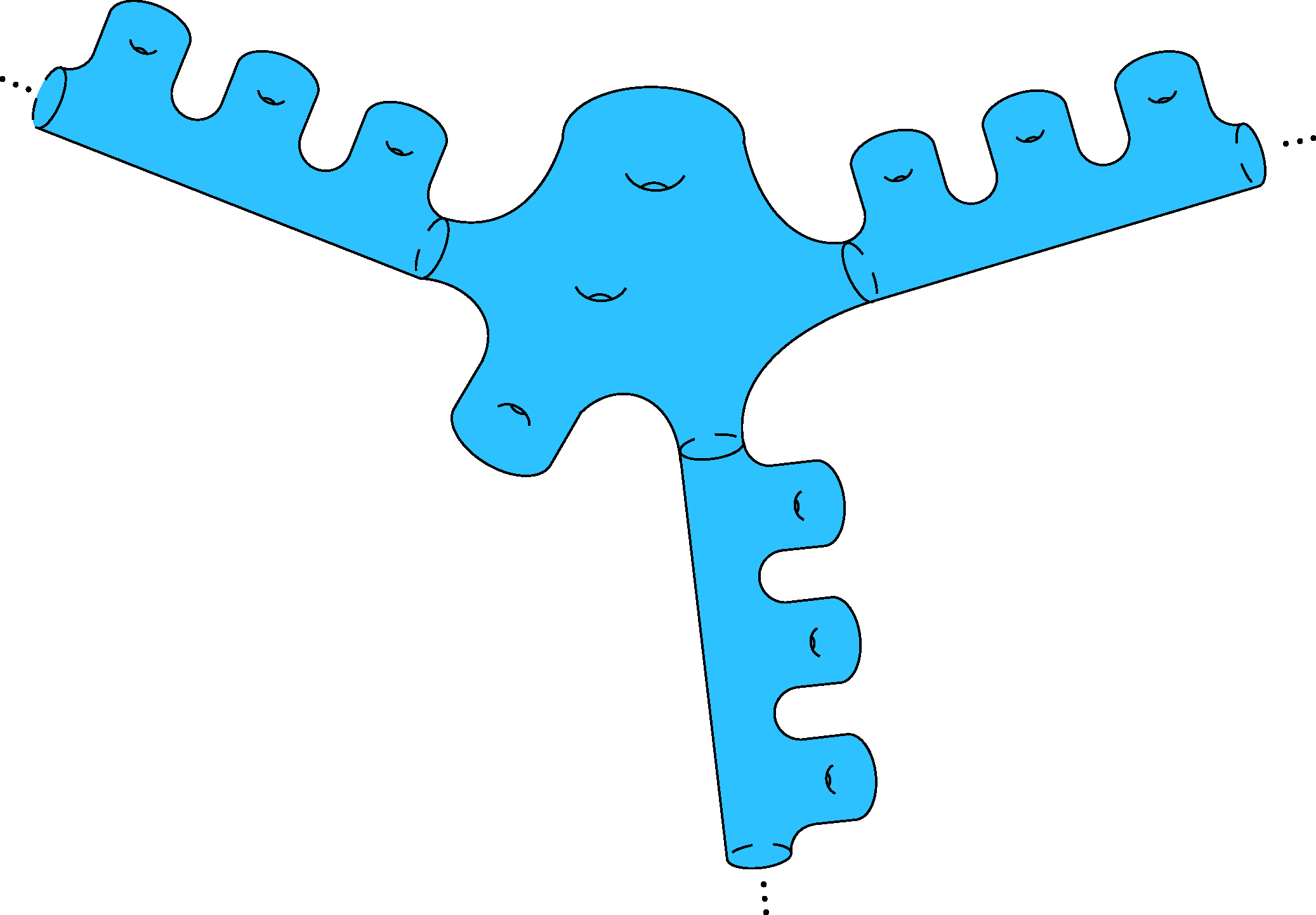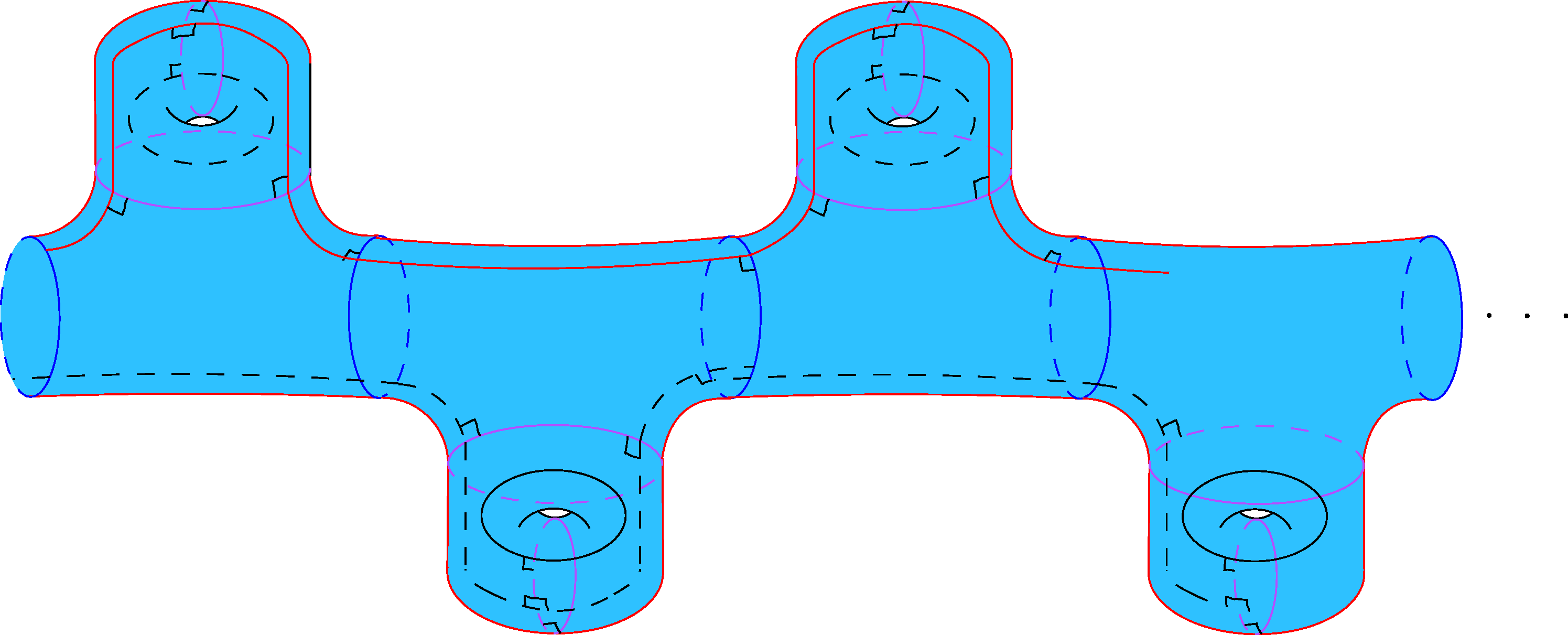 Basmajian, Hakobyan, and Šarić in [BHS] extensively studied surfaces called tight flute surfaces. They constructed them in the following way. Start with a geodesic pair of pants with two punctures and a closed geodesic boundary. Attach geodesic pairs of pants with two closed geodesic boundaries and one puncture in an infinite chain. The result is a tight flute surface. They called the closed geodesics between pants, cuffs. Their lengths give the length coordinates {ln}, and their twists give the twist coordinates {tn}. When the twist of each cuff is one half, you get a half-twist tight flute surface (see Figure 1).